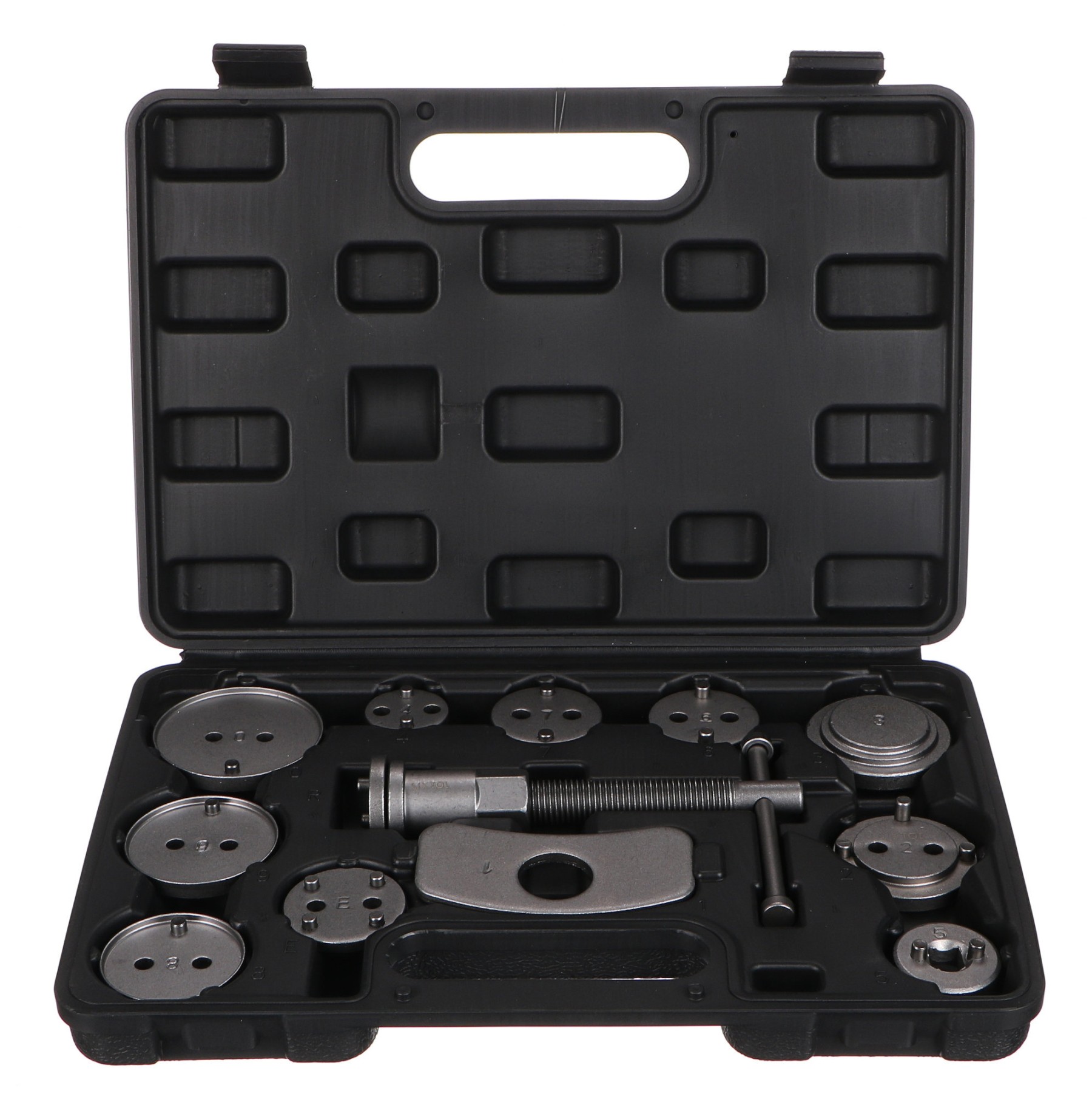 Universelles Bremssattelrückstellwerkzeug-Set BRAKE SET BLACK mit 12 Teilen in einem schwarzen Kunststoffkoffer, geeignet für die