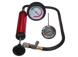 0-2,5 bar und 0-35 psi. Das Set enthält 12 Aufsätze und Adapter für verschiedene Fahrzeugmarken sowie ein Thermometer zur Messung der Kühlmitteltemperatur mit Skala 0-200 °C und 0-400 °F. Die Werkzeuge sind in einem Kunststoffkoffer verstaut, der die Lagerung und den Transport erleichtert.