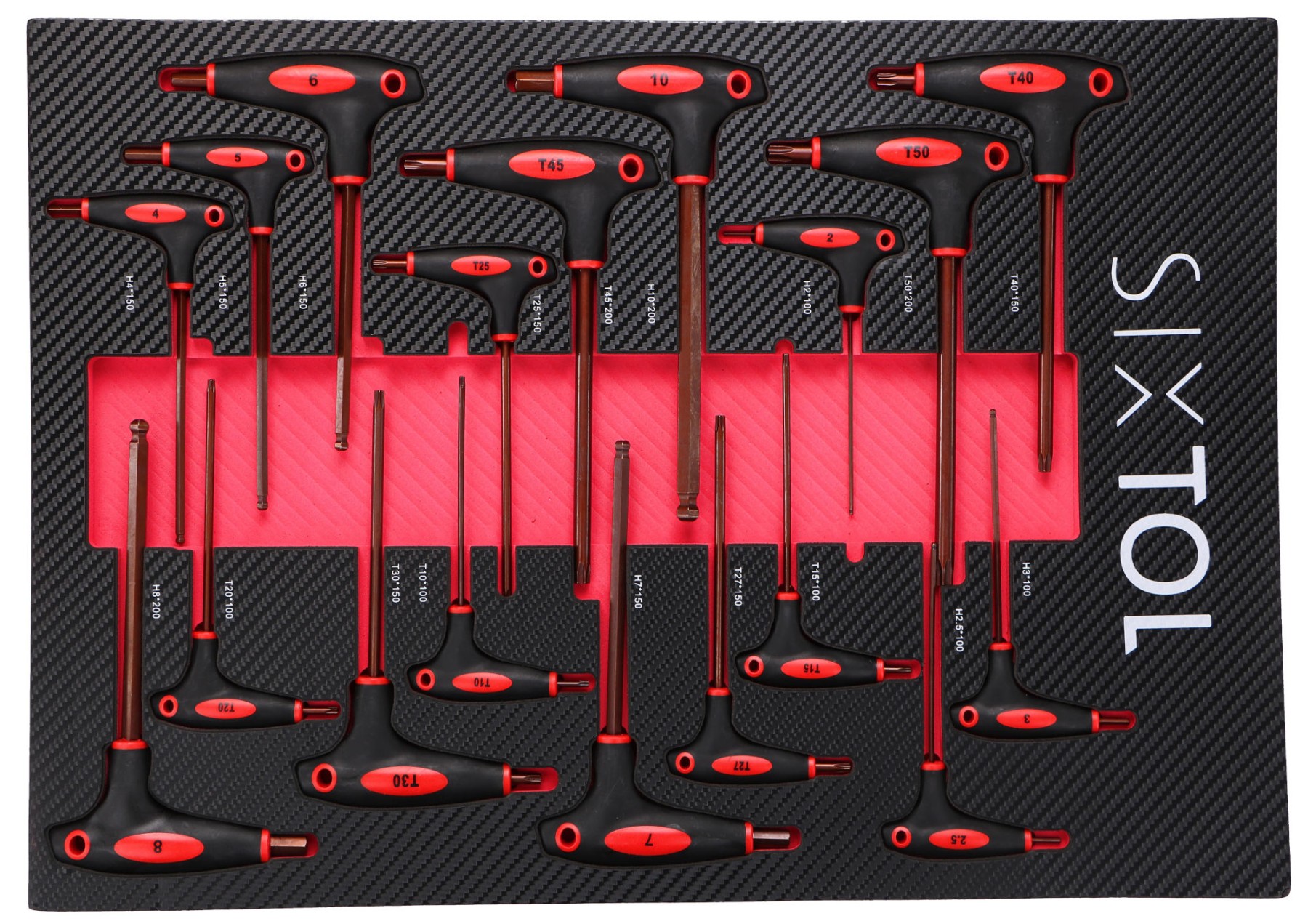 - 18x Torx-Kombinationsschlüssel: 6; 7; 8; 9; 10; 11; 12; 13; 14; 15; 16; 17; 18; 19; 20; 21; 22; 24 mm